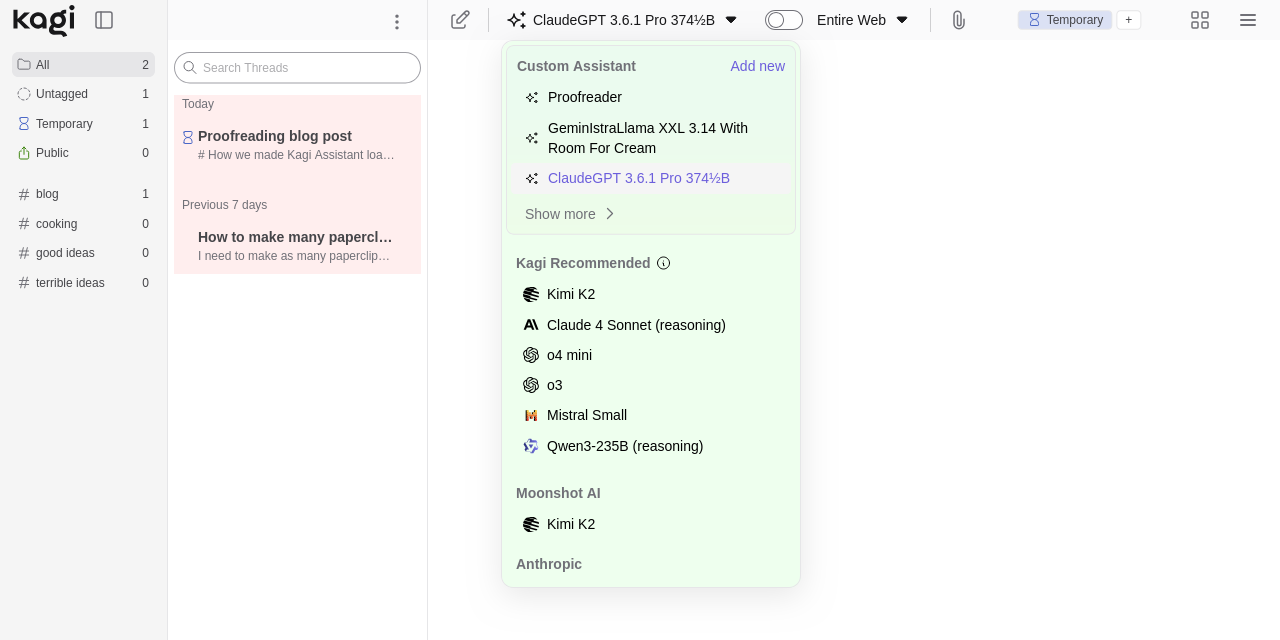 Kagi Assistant 2.0 was released almost exactly a year ago. At that time, it had already been through half a year of internal development which, for a variety of reasons, had gone a bit more chaotically than we'd hoped. The code has the scars to prove it. Somewhere in the back of my head I keep a fuzzy mental list of components that were written in ways that made total sense at the time but are now in dire need of refactoring. (I'm happy to report that we've worked most of our way through that list.)